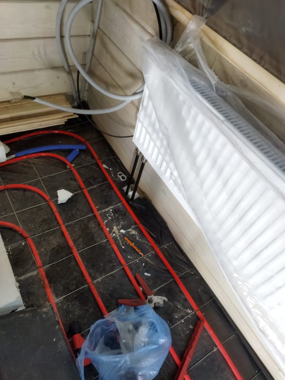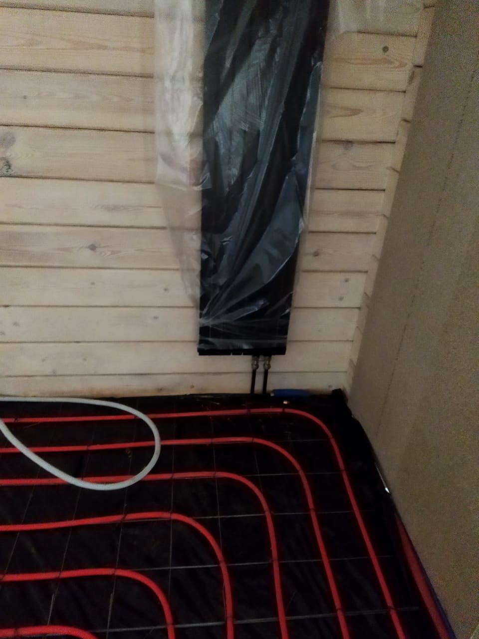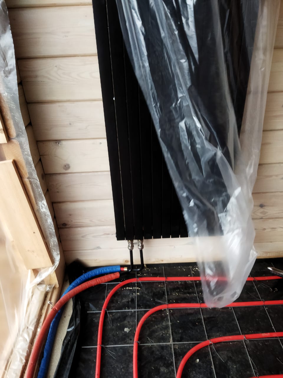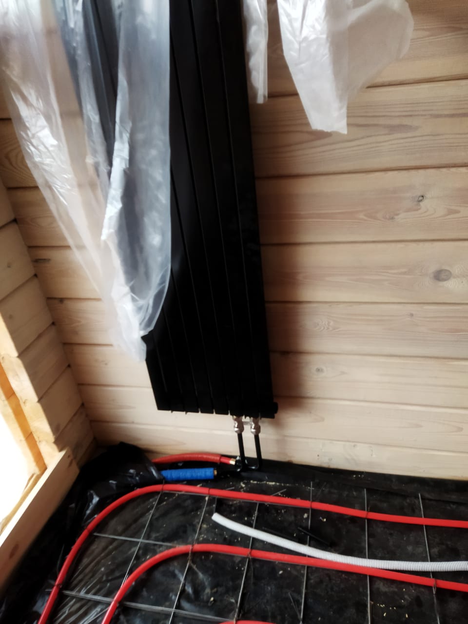 Протянули теплотрассу от котельной в основном доме до гостевого дома-бани, смонтировали радиаторы и трубопроводы, произвели запуск и настройку системы