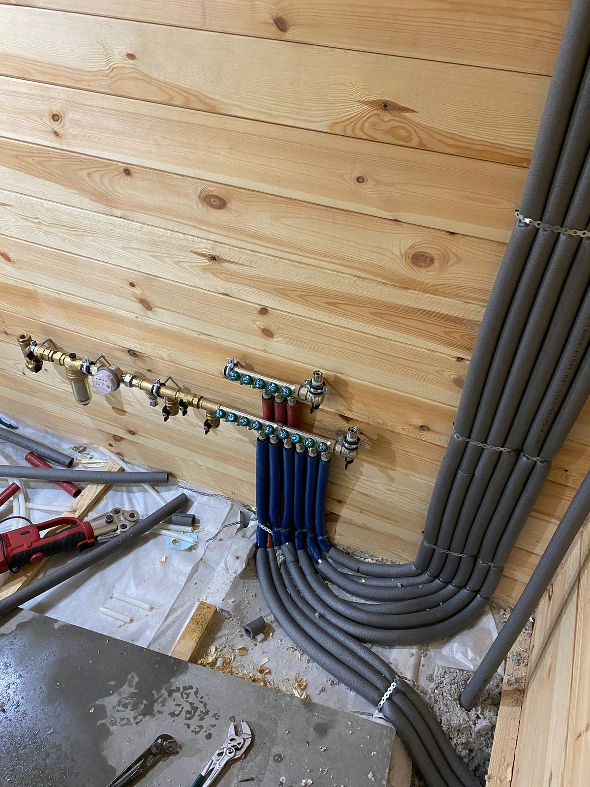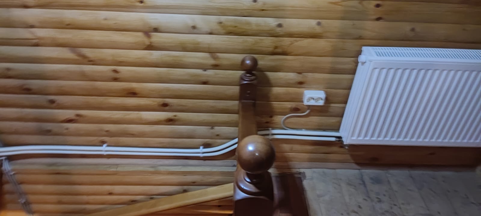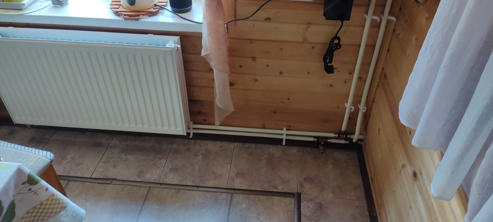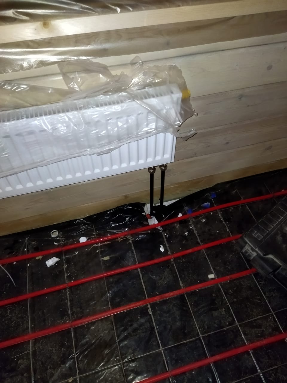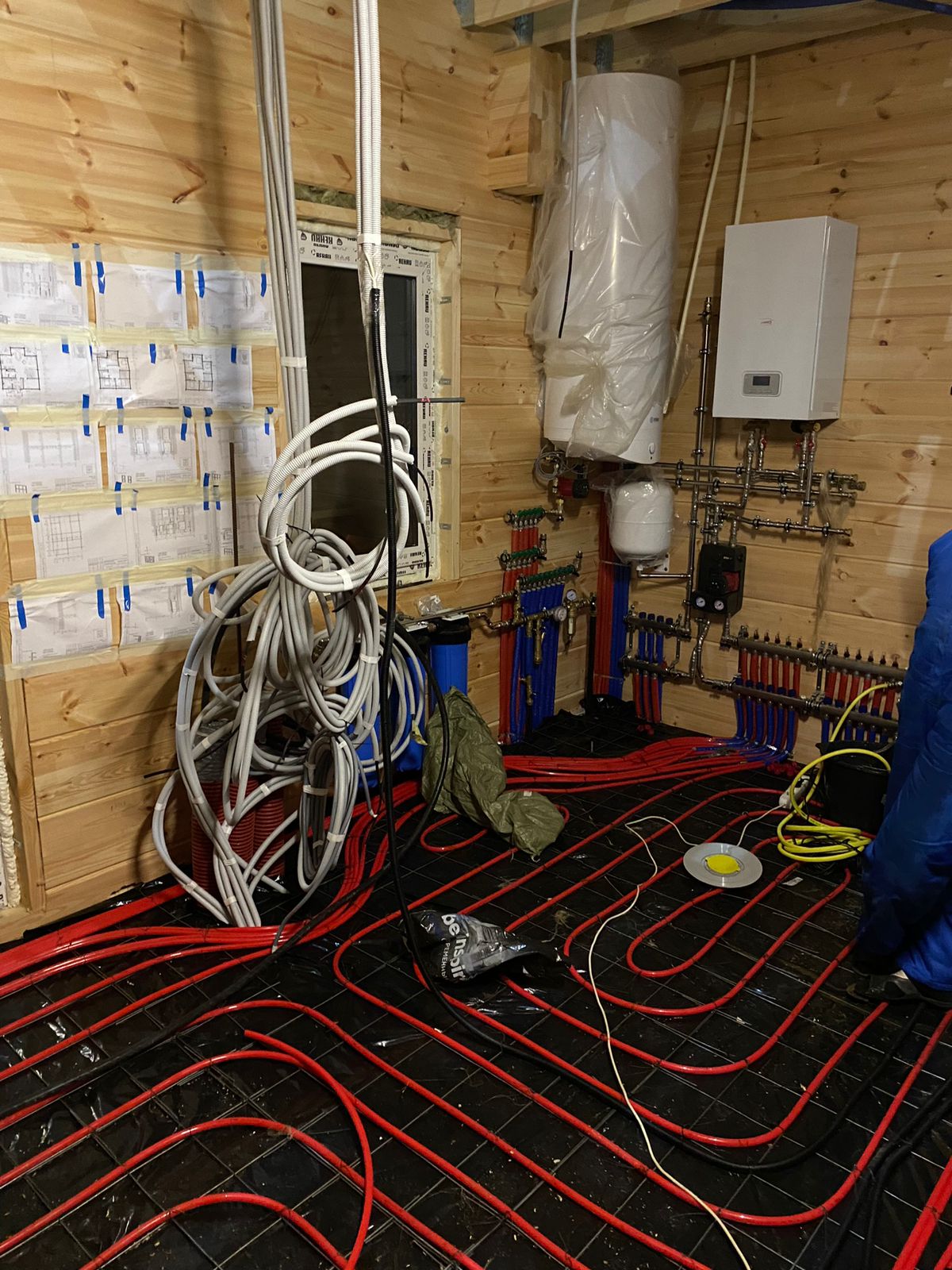 Протянули теплотрассу от котельной в основном доме до гостевого дома-бани, смонтировали радиаторы и трубопроводы, произвели запуск и настройку системы