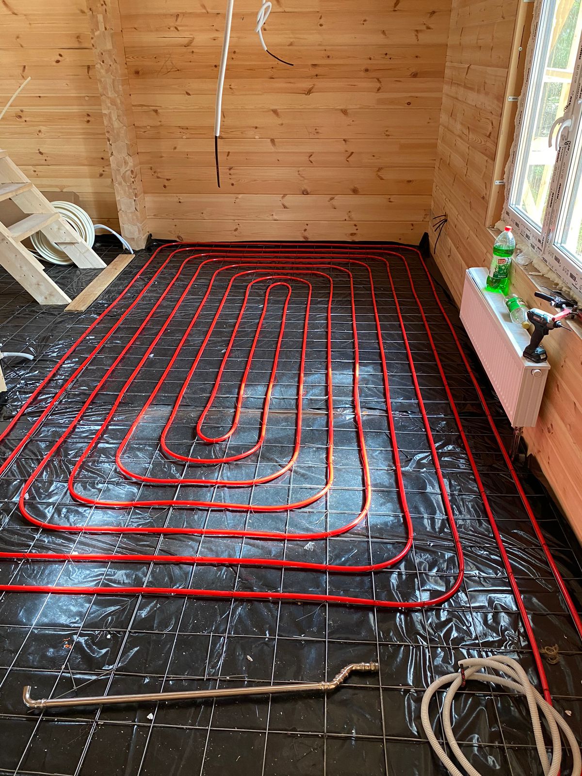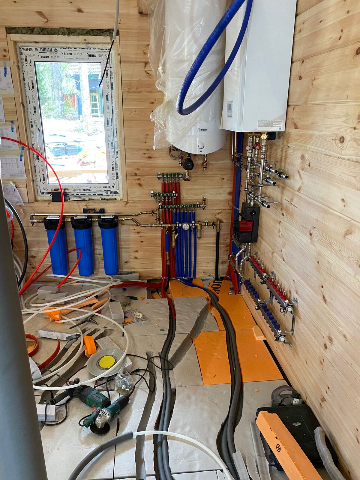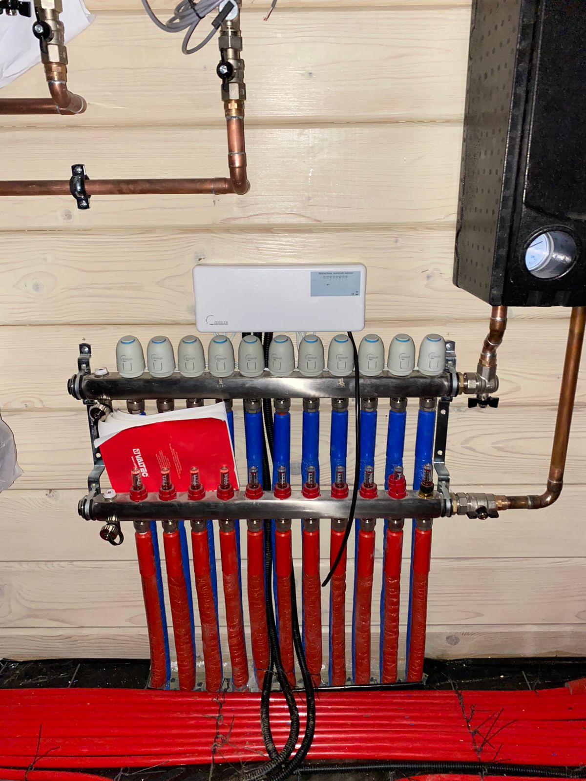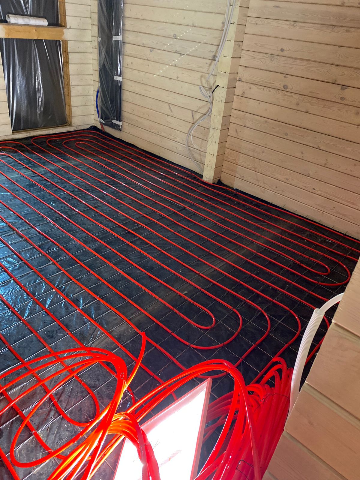 Протянули теплотрассу от котельной в основном доме до гостевого дома-бани, смонтировали радиаторы и трубопроводы, произвели запуск и настройку системы