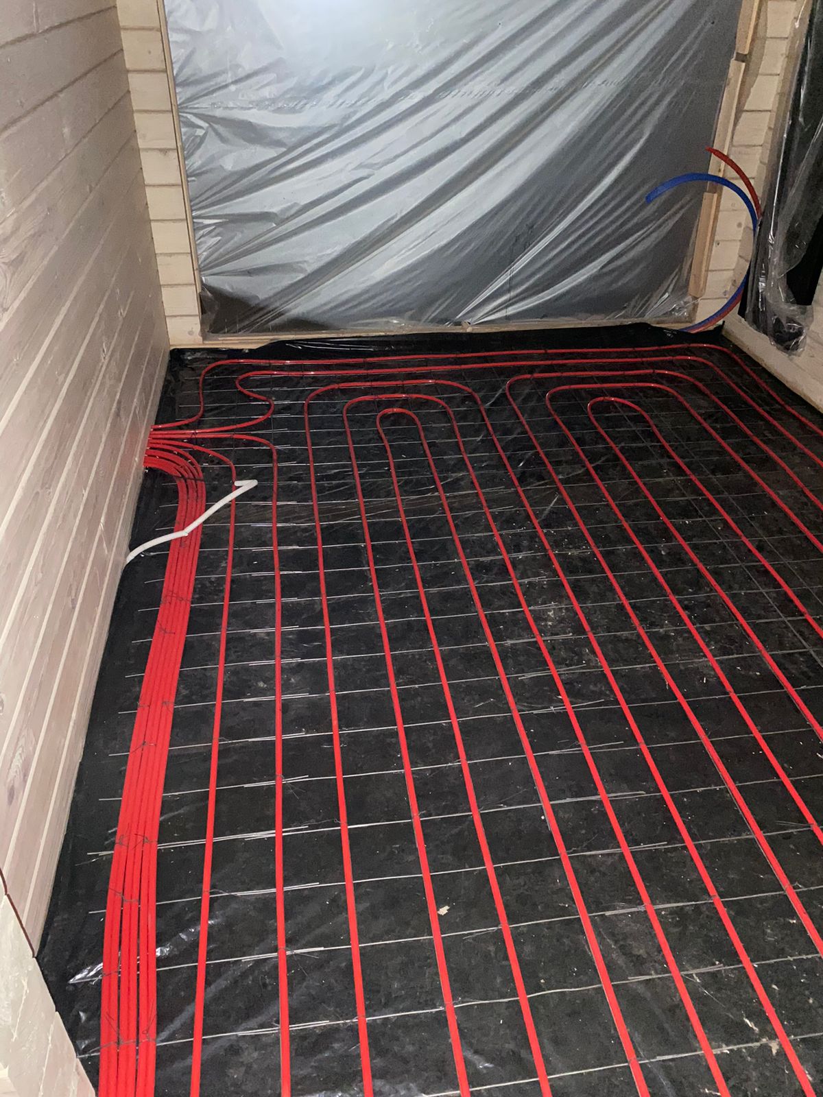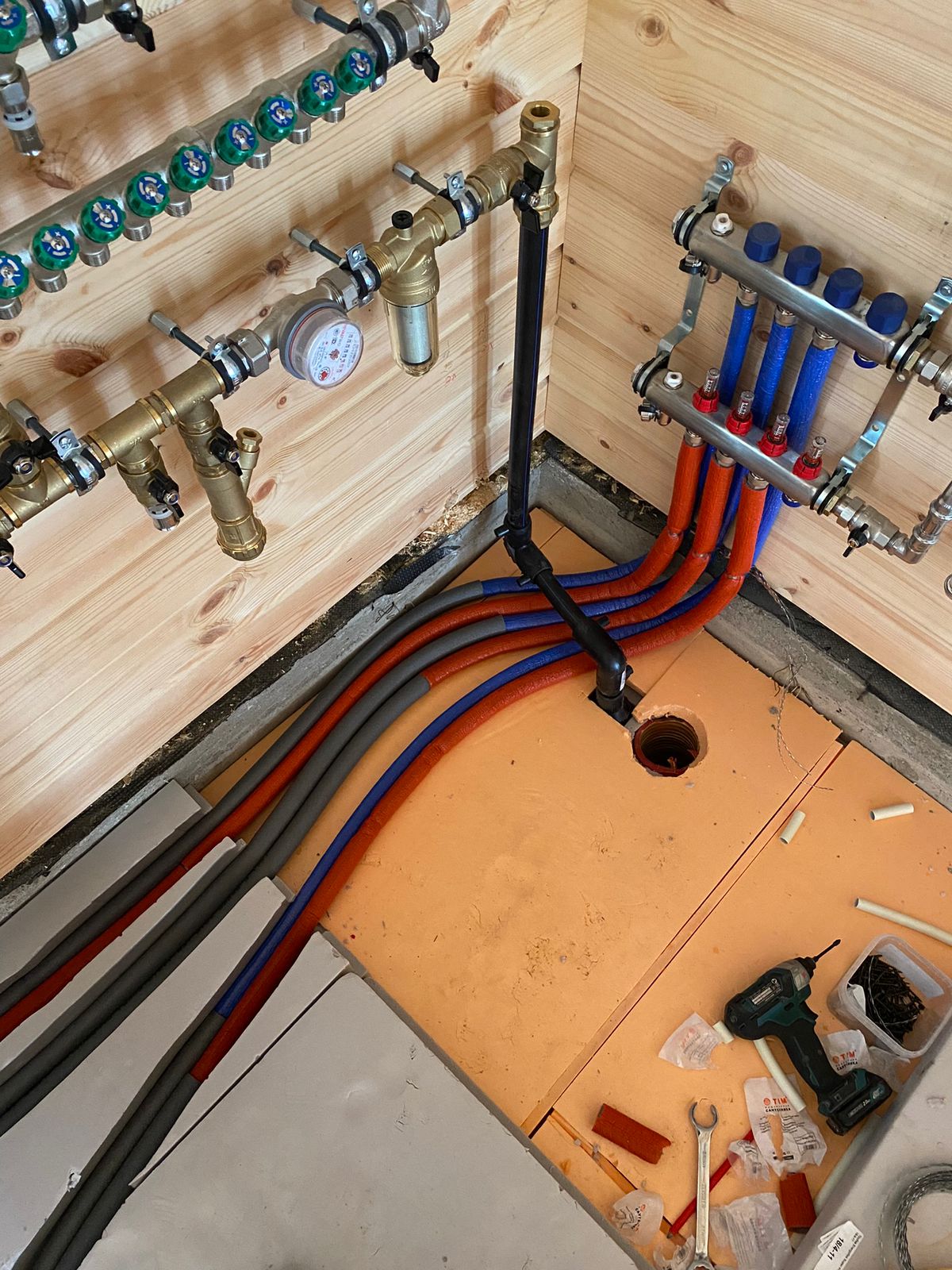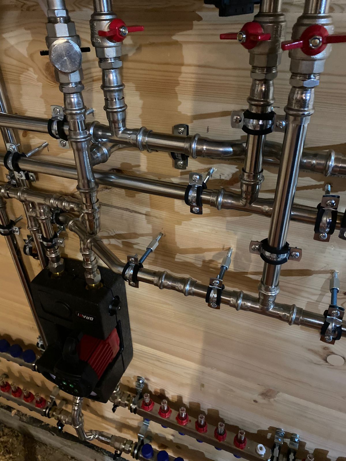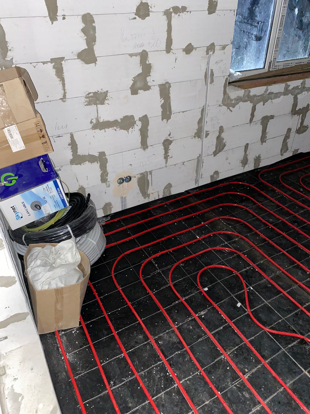Протянули теплотрассу от котельной в основном доме до гостевого дома-бани, смонтировали радиаторы и трубопроводы, произвели запуск и настройку системы